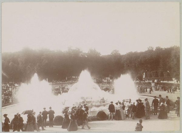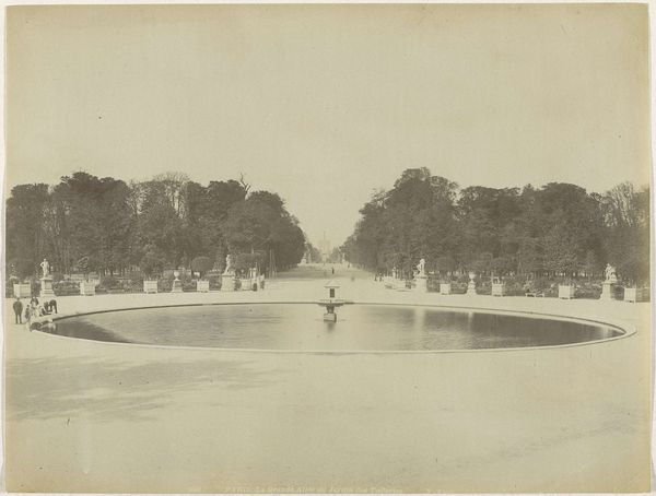 Editor: So, this albumen print is titled "Fountain with flowerbeds in the Palm Garden of Frankfurt," believed to be taken by Johann Friedrich Stiehm after 1871. It has such a faded, dreamlike quality, almost ethereal. What draws your eye when you look at it? Curator: My gaze is immediately drawn to the central fountain, a classic symbol of life, abundance, and renewal across cultures. Water itself, in nearly every mythological system, is the origin, the primal source. The very rigid garden structure is intriguing too, in contrast. Do you see any other symbols at work here? Editor: I noticed the symmetry and geometric shapes of the garden, a stark contrast to the more free-flowing fountain and natural setting just beyond. It feels very…controlled. Curator: Precisely. Gardens are frequently portrayed as a type of paradise, consider the Garden of Eden. Yet, this feels distinctly artificial. It evokes a yearning for order and a carefully constructed version of nature. It seems to highlight the duality between civilization and the untamed wilderness. Why do you think the artist chose this high vantage point? Editor: Maybe to show the whole scope, that human manipulation of nature… I’m starting to wonder about the psychological implications of arranging nature this way. Curator: Indeed, the camera freezes a cultural moment. Remember the Haus meaning "house" is written on the picture implying the angle and how important seeing and experiencing the "view from the Haus" was, as a symbol and lived experience for many at this time. Editor: It's interesting to think about this image as a cultural snapshot, filled with hidden symbols and meanings about humanity’s place in the world. Thanks! Curator: The interplay between constructed space and the desire for natural abundance. Fascinating!