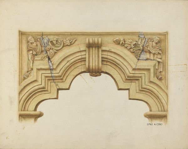 Here we see E. Boyd’s watercolor and graphite rendering of the ‘Lunette from Altar-Church at Llano Quemado Altar Rail-Church at Sanctuario, Chimayo’. Boyd created the work during a time of significant cultural change in the United States. As an artist and historian, Boyd dedicated much of her career to studying and preserving the traditional arts of the Spanish Colonial period in New Mexico. She was particularly interested in the ways in which these art forms reflected the unique cultural identity of the region’s inhabitants. Her work provides insight into the blending of indigenous and European artistic traditions. In this piece, Boyd captures the visual essence of a lunette, which features a dove surrounded by radiating lines, and a section of an altar rail from a church. We can feel Boyd's deep appreciation for the craftsmanship and cultural significance embedded in these objects. She documented them at a time when they were often overlooked or misunderstood. Boyd’s artwork invites us to reflect on how cultural traditions are maintained and transformed over time, and how art can serve as a powerful expression of community identity and spiritual belief.