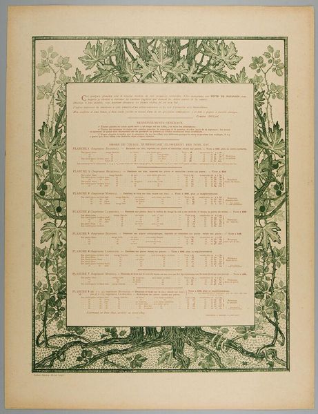 Charles-Marie Dulac created this ornamental print as a title page for his series "Landscapes", sometime before 1898. The print is characterized by its symmetrical composition and the contrast between the structured text and the organic border. Dulac uses a muted palette, predominantly greens and browns, which enhances the naturalistic theme. The layout is meticulously organized, presenting the textual information in a clear, hierarchical manner. However, this rationality is playfully subverted by the ornamental frame featuring intertwining vines, leaves, and roots, creating a dynamic interplay between the text and the border. This contrast engages the core principles of semiotics, where the structured text functions as a signifier of order and information, while the organic border signifies nature. The print challenges fixed meanings, suggesting that even within structured systems, nature's unpredictable, free-flowing essence persists. It blurs the boundary between design and representation, inviting us to consider how these elements interact to produce new meanings.