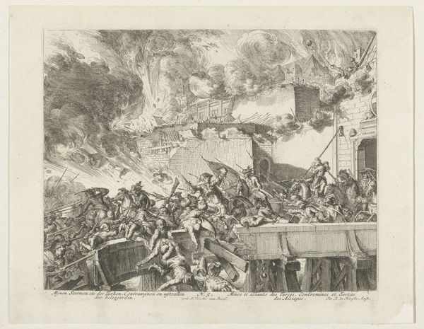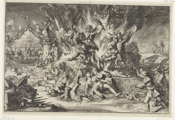 Curator: Christian Bernhard Rode created this etching, "Christus verschijnt bij het Laatste Oordeel," between 1767 and 1779. It's currently part of the Rijksmuseum's collection. What's your initial impression? Editor: The immediate feeling is...chaos. Look at the stark contrast between the serene, illuminated upper register and the tumultuous, shadowy scene below. There’s an overwhelming sense of drama conveyed through the composition alone. Curator: Indeed. The print encapsulates Baroque ideals by depicting not just the theological event of the Last Judgment but its societal implications. Rode was working during a period of significant religious and philosophical debate, and images like this served to reinforce societal norms. The elite were able to communicate moral virtues to everyone. Editor: Focusing on the formal elements, the dynamism achieved through line and light is quite remarkable. The figures in the lower portion are all caught in moments of anguish, conveyed through energetic strokes. Notice how those fragmented architectural elements further amplify this feeling of disarray? Curator: The fragmentation is also reflective of broader anxieties. The toppling pillars could symbolize the fall of empires or the instability of earthly power in the face of divine judgment. This piece circulated as a print, meaning it became quite accessible. Editor: Consider also the ascending figures bathed in divine light; their poses are more idealized and elongated, directing our gaze upward to Christ. The tonal gradation is subtly orchestrated, guiding our eye and emphasizing the divide between earthly suffering and divine grace. Curator: The power dynamic, absolutely. Artworks such as these shaped collective thought by showcasing clear religious hierarchies. Those ascending into Heaven are notably still part of the socio-political elite in that they’re dressed formally with great poise. Editor: Yes, the artist employs recognizable iconography while adding his personal interpretation to amplify the expressive potential of the composition. There’s definitely something more complex happening here than simple didacticism. Curator: Overall, "Christus verschijnt bij het Laatste Oordeel" serves as a cultural artifact, reflecting 18th-century social anxieties and belief systems concerning morality and salvation, brought into accessible locations. Editor: And for me, considering Rode's print primarily triggers an interest in dissecting and contemplating the composition as a method of deconstructing meaning that comes through pictorial structure and internal aesthetic forces.
