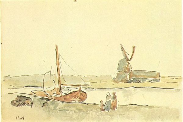 Curator: Louise Abbéma's "La plage d’Étratat," painted in 1908, captures the unique coastline of Normandy with impressionistic strokes. What’s your first impression? Editor: The cool, almost desaturated tones create a very melancholic mood. The light feels very soft and diffuse, but also a bit bleak. It really speaks to the ephemerality of coastal life, the constant negotiation between land and water. Curator: The coastal scene in Étratat has indeed become iconic. Abbéma’s choice to focus on the boats drawn up on the beach does offer an intimate and everyday look into this place. It shifts our perspective to the locals' interaction with this celebrated landmark. Editor: Yes, it's less about the grandeur of the cliffs themselves and more about how humanity situates itself within that landscape. These boats feel stranded, reliant on tides that may or may not cooperate. I find the scene quite loaded with that sense of uncertain hope and potential exploitation. Curator: Absolutely. Abbéma often worked en plein air to truly capture these transient effects of light. The sails catch the light, infusing them with an almost symbolic importance. As emblems of travel and trade, the vessels can stand in for the wider societal shift of Étratat transitioning into a resort destination for artists and the bourgeoisie. Editor: Considering Abbéma was openly lesbian and lived and worked within very specific circles of Parisian society, I wonder what her relationship with these boats as a symbol of commerce might have been. Were they vehicles of personal liberation, or indicative of industries that enabled exploitation and alienation, even then? Curator: It's fascinating to read that potentially ambiguous tension within this scene. Even now, a painting so evocative can elicit diverse cultural connotations, prompting contemplation about industry, independence, and freedom. Editor: Right. There are layers here. These aren't simple aesthetic choices; they reflect broader dialogues about humanity's place in the world and on our fragile coastlines. Thank you for sharing your knowledge with me, and sparking even more layers of thought!