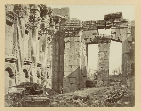 Curator: Here we have Féliz Bonfils' photograph, "Ruïne van de tempel van Bacchus, Baalbek," taken sometime between 1867 and 1877. It's a gelatin silver print, and quite a sight. Editor: It certainly is...a melancholic grandeur, almost sepia-toned into memory itself. All those fallen columns. You can practically hear the echoes. Curator: Bonfils was one of the first commercial photographers in the Middle East. Think of the physical effort! He lugged all that heavy equipment to Baalbek, now in Lebanon, just to capture this ruin. It’s all about materiality here—the silver in the print, the monumental stones. Editor: And the light! The sun's merciless glare, bleached into those ancient stones… I imagine Bonfils feeling that oppressive weight, the centuries pressing down as he adjusted his lens. It almost feels like *he's* unearthing the past along with his photograph. Curator: He was serving a growing market. People back in Europe had this fascination with the "Orient," fueled by archaeology and empire. He's not just recording history; he's packaging it, turning it into a commodity. Think of the laborers who quarried, carved, and raised these columns in the first place. And now this, a new layer of labor, the photographer making his own mark. Editor: So true...the romance of ruins concealing layers of very real work, creation, and then deconstruction…It all sort of returns back to earth in the photograph too—the dirt, the scattered stone. But something majestic survives the photographic processing, beyond simple reportage, the aura, the echo remains. Curator: It makes you wonder, doesn’t it? Who gets to tell the story of a ruin, and whose labor do we choose to see? The ancient builders? The photographer? The colonizers who consumed the images? Editor: Precisely. The photograph is a beautiful document of exploitation too— of both past architectural labour and the early photographic industry and economy. Curator: A photograph is never just a window; it's always a mirror reflecting our own time, even when it shows us the past. Editor: Indeed. A mirror clouded by time and context, challenging us to see more than just what's on the surface.
