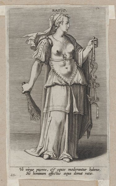 Editor: Here we have "Mensura, from Proposopographia," an engraving by Philips Galle made sometime between 1580 and 1595. The figure is so compelling, her gaze is arresting. I’m struck by her partial nudity alongside the tools of measurement; it seems like such a deliberate contrast. What do you see in this piece? Curator: Well, situated within its historical context, we must acknowledge how this engraving participates in the cultural construction of ideal womanhood. Consider the Mannerist style: elongated forms, artificial poses. How does the allegorical figure of 'Measure' embody or challenge the patriarchal expectations of the era? The tools she wields – the compass, the square – symbols of rationality and control, are juxtaposed with her exposed body. Editor: So, you're suggesting it’s more than just a representation of measurement; it's a statement about the female body and intellect? Curator: Precisely. Ask yourself, how does the artist use the female form to allegorize abstract concepts? In what way does this depiction reinforce or subvert prevailing notions of women’s roles in intellectual and artistic production? Is she being empowered or objectified, or can it be both? Editor: That’s fascinating. I hadn’t considered the inherent power dynamics at play here. Curator: Galle is making a statement through this visual language; these prints circulated among a specific intellectual class. Examining her body language also—she presents these instruments proudly, so perhaps she wields some amount of autonomy? Food for thought, indeed. Editor: I see this piece with new eyes now. Thank you for the insights! Curator: The pleasure was all mine. It’s exciting to unravel these layers together.