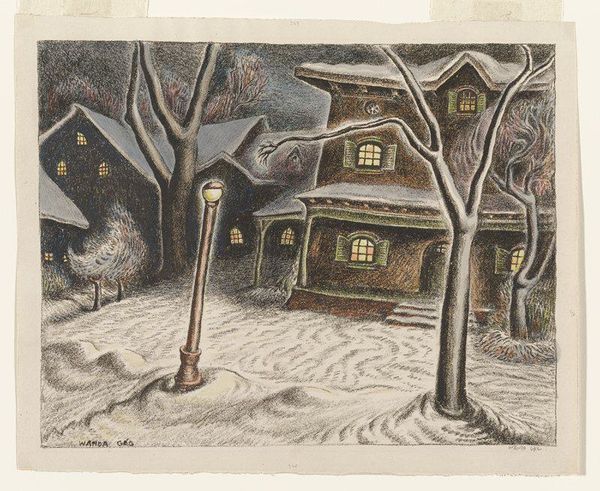 Editor: This is Wanda Gág’s "Winter Twilight," made in 1927. It's an ink drawing, or a print. The mood is definitely hushed and a little eerie, even. What strikes me most is the texture – the almost frantic, scribbled lines create such a palpable sense of cold. What stands out to you? Curator: I see a commentary on labor and its relationship to domesticity. Notice how the intensive mark-making, this labor-intensive process of creating the image with ink, mirrors the unseen labor that maintains the domestic spaces illuminated in the windows. Editor: That's an interesting connection, I hadn't thought about it that way! Can you elaborate on that a bit? Curator: Gág used the traditional medium of ink, but her technique, this dense layering of lines, challenges the idea of printmaking as purely reproductive. It's a physically demanding process. Consider, too, the social context: 1927, the rise of industrialization, mass production. Yet, Gág chooses a handmade approach to depict what seems like a cozy, pre-industrial scene. Isn’t she subtly elevating "craft" by highlighting its connection to both labor and home life? Editor: So, you are saying she’s making us think about how things are made, not just what is depicted? It's almost a commentary on the value we assign to different types of work. Curator: Precisely! The piece prompts questions about artistic production and the materials involved in its making, it emphasizes labor that is often devalued. Editor: That perspective really changes how I see this. Thanks for opening my eyes to the material conditions of the artwork. Curator: And thank you for noticing those textures; materiality matters, and it certainly changes our perception of everything we see.