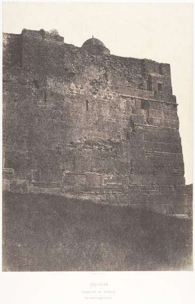 Curator: Standing before us is Auguste Salzmann's "Jérusalem, Enceinte du Temple, Face Nord de l'angle Nord-Est," a photogram created between 1854 and 1859. Editor: My first impression is of imposing weight and a profound stillness. The stark contrasts evoke a sense of history bearing down, almost suffocating the light. The very texture of the stone suggests untold stories. Curator: Indeed. Salzmann’s choice to photograph the Temple Mount's northern enclosure during this period speaks volumes. It aligns with broader 19th-century Orientalist projects, but we must acknowledge the colonial gaze inherent in depicting Jerusalem as a site ripe for Western interpretation. The photograph itself, as a medium, becomes implicated in these power dynamics. Editor: The image is structured around enduring symbols - the wall, the arch. It evokes the themes of power and faith, revealing the city's multilayered spiritual history as seen through its architectural forms. You see how the single arched window almost invites contemplation... Curator: The symbolism extends further when we understand Salzmann's personal motivations. Commissioned to authenticate biblical sites archaeologically, he believed in the photograph's unique capacity to capture truth. However, "truth" is always subjective. By framing the image devoid of contemporary inhabitants, he indirectly reinforces a narrative of Western ownership of the land's history. It highlights the political weight an image like this carries. Editor: He immortalized this corner in shades of grey...almost like it wants the observers to imagine its former color. The arch is indeed, a silent gate between ages. It triggers that collective human experience of awe looking at something created long before us. Curator: It’s a crucial point. Salzmann's technique emphasizes the monumentality while simultaneously erasing the continuous cultural presence, primarily of the local communities. Editor: There’s also a certain austerity in the image. Perhaps that draws a feeling of respect. Curator: Yes, the aesthetic invites a specific reading, one where Western values and ideals take center stage. And as we contemplate the enduring structure depicted by Salzmann, we can ponder how architectural heritage becomes a site of contesting narratives about identity, land, and power. Editor: Ultimately, reflecting on the way lasting architecture becomes this eternal beacon through the ages.