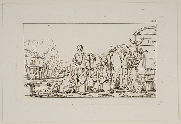 Curator: Jacques-Francois-Joseph Swebach's "Plate XXXIV" offers a glimpse into rural life, depicted with a refined linear style. What strikes you first about this work? Editor: The starkness, actually. The minimalist lines almost feel like a commentary on the simple lives illustrated. Curator: Indeed, Swebach often explored the power dynamics inherent in such scenes. Notice the authority of the mounted figure, contrasted with the labor of the woman and child. Editor: And how this reflects the era’s social hierarchy, doesn't it? The figures' class positions are undeniably present. Curator: Precisely. Art like this serves as a mirror, reflecting the power structures present. Editor: It also reminds us that behind every picturesque scene, lives steeped in inequality persist. Curator: It’s a reminder that our interpretation of art is linked to the present moment and what we are currently grappling with in society. Editor: Absolutely. A piece like this really urges us to question the stories we tell about history.