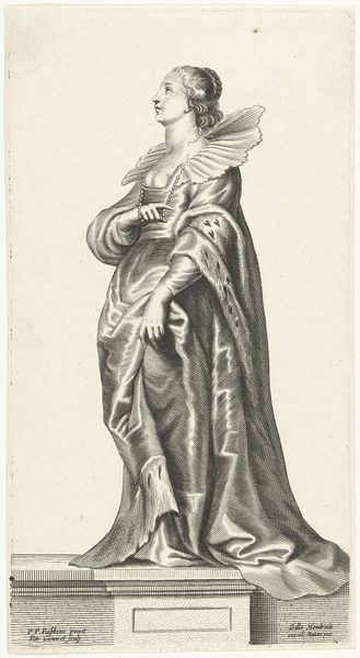 Curator: Let’s discuss "Apostle John with chalice and snake," an engraving housed here at the Rijksmuseum, created sometime between 1623 and 1660 by Pieter de Bailliu. Editor: My immediate impression is one of dramatic solemnity, the stark contrasts typical of baroque printmaking really highlighting the weighty fabrics and the almost unsettling imagery of a snake emerging from a chalice. Curator: It's fascinating to consider this engraving within its historical context. The Apostle John is often depicted with a chalice, but the addition of the snake references a specific legend. It speaks to the challenges faced by early Christians and their struggles against perceived heresy and toxicity, here materialized through the symbol of the snake. The engraving almost acts as a visual theological argument, asserting the triumph of faith. Editor: Right, but let’s consider the engraving process itself. The controlled and laborious act of carving these fine lines into a metal plate would have required significant skill and time. It's interesting how such a mechanical reproductive technique can be employed to convey what’s supposed to be an emblem of faith. Are we supposed to admire the saint, the craftsman, or perhaps, both? What about the material reality of its consumption: who would have purchased this? Curator: These prints often served as devotional aids, yes, but also reinforced existing societal structures, disseminating ideologies and beliefs. When seen through that lens, this image is a fascinating cultural artifact. I wonder how much autonomy the artist had here. Editor: A powerful reminder that objects, regardless of their spiritual subject, are ultimately commodities, shaped by labor, class, and consumption. Thinking of the cultural exchange across religious icons really frames this discussion. Curator: Indeed, understanding the multiple layers interwoven within this baroque engraving allows us to analyze its message. Thank you for sharing your insight on materials, as I explore it further through religious dissemination, and a deeper dive into Saint John's cultural narrative. Editor: Always enlightening to consider art through its tangible being and conditions of production, and how those shaped our engagement with art objects themselves.