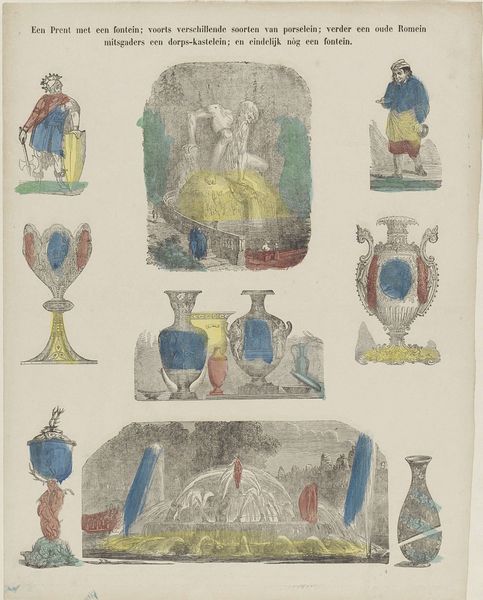 This print, made by the Monogrammist PB, presents a collection of objects rendered through wood engraving. The composition is arranged in a grid-like manner, featuring porcelain, figures, and, notably, fountains. The stark contrast between the black lines and the white paper creates a visually arresting effect, emphasizing the form and texture of each object. The fountains, depicted with intricate detail, draw the eye through their dynamic lines, suggesting movement and vitality. This use of line and form serves not only to represent these objects but also to create a structured visual experience. The print challenges fixed meanings by juxtaposing disparate elements, encouraging viewers to question the relationships between them. This destabilization prompts an exploration of how the print engages with new ways of thinking about space, perception, and representation.