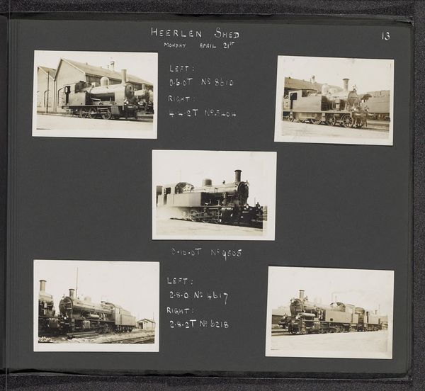 This is a black and white photograph of the Stephenson Locomotive Society posing with locomotives in Roosendaal en Heerlen. Since we don’t know who made it or when it was made, we have to treat the process of its making as something like a found object. I love the way the trains occupy most of the space in the image, looming over the members of the Locomotive Society posing in front of them. The surface of the image is smooth and matte, allowing for details to come forward despite the picture's age. Each face, each rail, is visible. The three separate photographs are arranged on a dark background that creates a striking contrast, adding depth and emphasizing the textures within the images. This arrangement reminds me of collage, or the work of Gerhard Richter, whose "Atlas" project arranges found photos on boards. Art making, like train spotting, can be an act of collection.