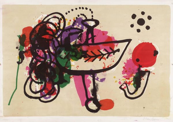 Curator: This chaotic swirl of colors and forms hits you immediately, doesn't it? Editor: It does. My first impression is kinetic. It feels like a scene barely captured, with figures emerging almost tentatively from the brushstrokes. It's titled "The Bike Girl," dating to 1958, and made by the American artist Larry Rivers. He worked in mixed media, specifically printmaking, to achieve this image. Curator: The title is interesting. The "Bike Girl" seems less about the specific object and more about the feeling of fleeting experience, almost a memory. Rivers had this fantastic ability to inject psychological weight into familiar scenes. It calls to mind a post-war sense of movement. The bicycle, even deconstructed, became this vessel for possibility, for venturing into an unknown future. Editor: Absolutely, the iconography suggests that sense of restless optimism following the war, coupled with that cool Beat Generation attitude. The subject matter, though a traditional figure study, becomes an almost abstract exploration. The colors he's used, though vibrant, don't quite define concrete shapes, which blurs our sense of reality in a pretty revolutionary way. Curator: Rivers walked that line constantly. Consider the influence of Abstract Expressionism, here, but applied to figuration, too. See how the gestural strokes give way to very familiar, everyday subject matter? That disruption creates tension; he's using accessible visuals but asking deeper, challenging questions about identity and existence in the atomic age. How interesting it is that he chose this specific visual language to ask these questions. Editor: Indeed. The rawness, the apparent "unfinished" quality, rejects the hyper-polished idealism often associated with preceding decades. Rivers, and pop artists like him, made it acceptable to present everyday life without aestheticizing everything beyond recognition. And think about the bicycle itself. It signifies more than just transport; it became an emblem of a newly mobile and leisure-oriented culture. Rivers cleverly employs a figure, that mode of transportation, and printing techniques to underscore this shifting landscape. Curator: Exactly. He pulls so many themes, so many feelings together. Looking at "The Bike Girl," I can practically hear the whir of the wheels, the rumble of city life and see that post-war psychological exploration all captured in layered inks. It really showcases art as something ever unfolding, not necessarily settled or resolved. Editor: For me, its impact is about the shifting face of contemporary existence. The piece captures something quintessential. With this image, Rivers challenges and intrigues, using art not just to depict life but to actively mirror and examine societal transformation.