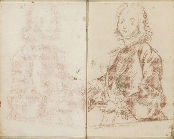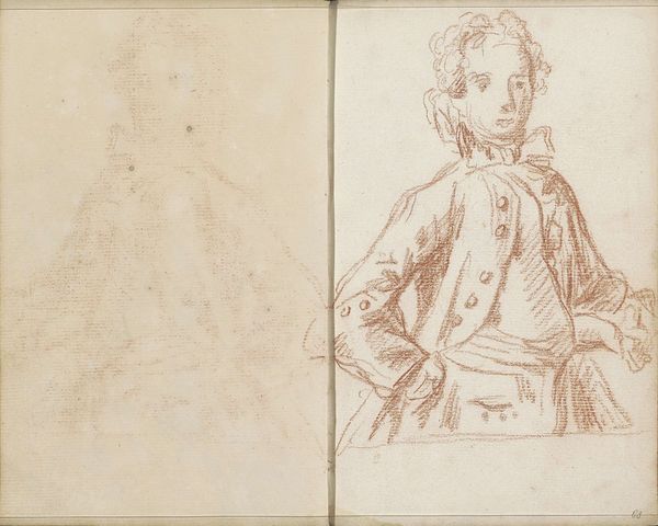 Curator: Today, we're looking at "Standing Man with an Outstretched Hand," a pencil drawing from sometime between 1710 and 1772 by Petrus Johannes van Reysschoot. Editor: It feels very immediate. The lines are light, giving it an airy quality, almost ephemeral. And the reddish-brown tone of the pencil on the toned paper adds warmth. Curator: Note the economy of line in constructing this figure. You can practically see the artist experimenting, searching for form. The use of toned paper is crucial, isn't it? It creates an immediate mid-tone, allowing van Reysschoot to build up shadows and highlights efficiently. Editor: Absolutely. And the subject's dress—the waistcoat, the long coat, the powdered wig—these are all key markers of the period. But what interests me is the incomplete quality of the drawing. It looks like part of the notebook is blank. Curator: Exactly! Think about sketchbooks at the time. They were working documents, records of visual investigations, and sites of material production, so the drawing might never have been meant to be finished. It might have served a different purpose, perhaps for workshop practices. Editor: The composition focuses very deliberately on the figure's stance and that outstretched hand; it demands the viewer’s attention and almost seems to suggest offering or engagement. Curator: Or instruction? Maybe the drawing was intended as a guide, used as study material for apprentices on how to pose the body. Remember this was the Baroque era when art workshops were small scale industries where they often had specific and secret modes of production and transmission of knowledge. Editor: It makes you think about the countless hours of labor that went into producing a polished Baroque portrait. This offers a peek behind the curtain of art making, almost challenging that 'high' and 'low' art divide. Curator: Precisely. Van Reysschoot's drawing offers insight into artmaking, revealing the raw, material origins behind finished portraits, or history paintings, produced and consumed at the time. Editor: The lack of detailed rendering shifts the focus to gesture, pose, and form. Overall, I would describe this work as showing experimentation, rather than intending to make a definitive statement about the man portrayed in the drawing. Curator: And by considering how such knowledge was embedded in social settings, this preliminary sketch opens up into discussions of Baroque period portraiture more widely.