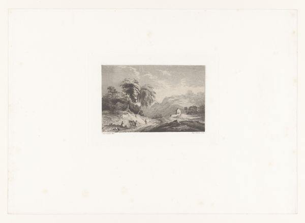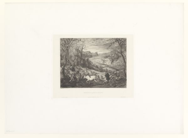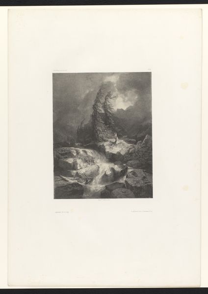 Curator: We’re looking at “Bergmeer,” created somewhere between 1839 and 1879. It's an etching and engraving. Editor: Oh, moody! Right away, I get a feeling of profound solitude. All those grays pressing in… feels like the quiet before a storm. Curator: It’s an excellent example of the realist landscape tradition. Consider how it portrays a specific environment, reflecting the social contexts surrounding man's relationship to nature, especially the growing industrial influence and the rise of urban centers. Editor: Exactly! The composition itself is fascinating – that small stream in the center vanishing between these imposing mountains. I keep wanting to follow it. Maybe it represents a fading path? A connection to some older, less crowded existence? I like that. Curator: What resonates with me is the technique. The density of the marks in certain areas and their near absence in others create such a dynamic range. It brings the power of sublime nature into your sphere. The landscape is not just geography but social history. The rising industrialization and urbanization shifted understandings of nature, contributing to social and cultural movements towards conservation. Editor: I hear you. It’s interesting how a small print, just through line and tone, can suggest so much vastness, and… loss. It invites you to reflect on these issues. The details invite an introspective contemplation and a journey within yourself. It whispers a lament, a sense of things passed or passing, the way nature shapes identity. Curator: Yes, in our time, faced with massive ecological disruption, prints like these can contribute to contemporary ecological conversations. They remind us of a shared, ongoing project that has been expressed across centuries and geographies. They are records of this connection to place and time. Editor: Absolutely. It’s a piece that encourages questioning our place, our actions. Even a whisper can start an avalanche. And, well, let's face it, these mountains really speak to me.