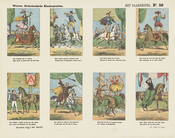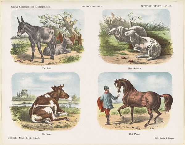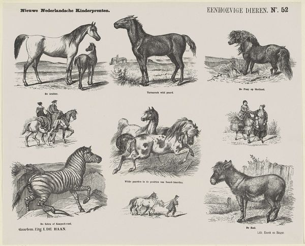 Editor: Here we have "Eenhoevige dieren" by Arie Willem Segboer, dating from around 1903 to 1919. It's a print, a lithograph actually, showcasing various equines. I'm struck by the arrangement; it almost feels like a biological chart. What jumps out at you from a formal perspective? Curator: The print operates primarily through its compositional structure. The arrangement of individual equine depictions into a grid establishes a sense of order, almost scientific categorization, as you observed. Note the varied techniques employed: the subtle washes of color differentiate each animal's type. This tonal variation is interesting and enhances our interpretation by introducing layers of complexity beyond mere representation. How do the variations in line work inform your interpretation? Editor: I see it. The Zebra has really tight, controlled lines, compared to say, the wild horses which seem more fluid and dynamic. Almost like the Zebra is more… 'civilized', or at least observed, versus the others. Does the realism of the styles create tension? Curator: The co-existence of styles creates visual interest by pointing to its purpose of instruction, suggesting observation and comparison of distinct breeds in distinct environments. Did Segboer aim to highlight nature’s inherent order? Are you familiar with similar charts by earlier natural scientists? How do we perceive such charts from a semiotic perspective today, versus the original audience? Editor: Good points! Thinking about the lines and forms, now I realize it isn't just about individual animals, it's about organizing and understanding the world itself. So, thanks for reshaping my viewing experience today. Curator: Likewise. Looking closely reveals layers that casual viewing can obscure. This layered visual approach enriches both understanding and enjoyment, certainly a good start for both of us.