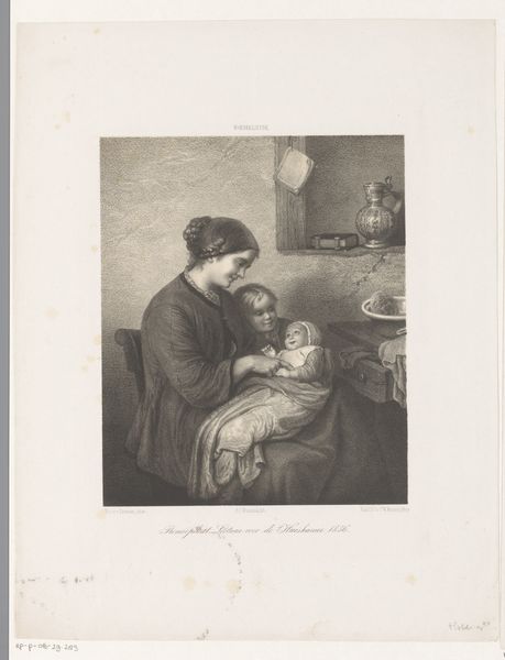 Constant Aimé Marie Cap created this etching, “Mother with Baby in Arms," using a metal plate, likely copper or zinc. The image is built up through tiny, deliberate lines incised into the metal. Acid then bites into these lines, allowing them to hold ink. The plate is then wiped clean, leaving ink only in the etched lines. When pressed onto paper, the image emerges, revealing the artist’s vision through the skilled manipulation of material and process. This printmaking technique allowed for the relatively quick reproduction of images. In Cap’s time, this was a rising mode of cultural dissemination. Etchings like these democratized art, making images accessible to a wider audience beyond the elite who commissioned original paintings. The very nature of etching – its reliance on mechanical reproduction – reflects the changing landscape of art and society during the industrial era. The work invites us to consider the social context in which art is made and consumed, and to question traditional hierarchies between craft and fine art.