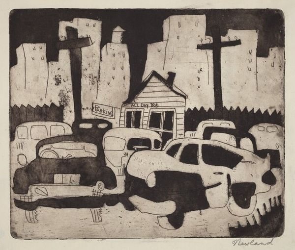 Curator: Here we have Niles Spencer’s "White Factory," a print rendered in graphite from 1928. Spencer, active during the Precisionist movement, focused intently on modern urban and industrial landscapes. Editor: It has a very flattened, almost austere quality. Despite the geometric nature of the buildings, there’s an unsettling stillness to it, as if all human activity has ceased. The absence of color heightens that sense of desolation. Curator: Indeed, that's typical of Precisionism's focus on the stark, simplified forms of the modern world. Think of the social context; this was painted during the interwar period when rapid industrialization prompted both excitement and anxiety about the future of labor. Spencer uses these industrial forms almost as icons of modernity, absent any signs of workers. It asks what happens to our perception of labor within our landscape. Editor: And I notice repeated patterns here: the bricks, the rows of windows, even the zigzagging fence at the base. These suggest not just industrial repetition, but also the human compulsion to organize and find order even in overwhelming conditions. Curator: Precisely. One could argue these forms highlight power structures embedded within architecture and urban design, influencing social interactions, economics, and politics within the everyday. Notice, also, the choice of black and white which evokes an industrial seriousness, like mechanical blueprints rather than idyllic landscape paintings. Editor: That absence of color also invites us to project our own emotional content onto the scene. Without vibrant hues, we're left with structure and shadow which makes me feel almost a little claustrophobic. Curator: This is an image wrestling with modern themes that echo long past their own era, and is very powerful as it continues to be reflective of ongoing modern concerns. Editor: This print highlights how simple forms and strategic absences can express potent and timeless concerns.
