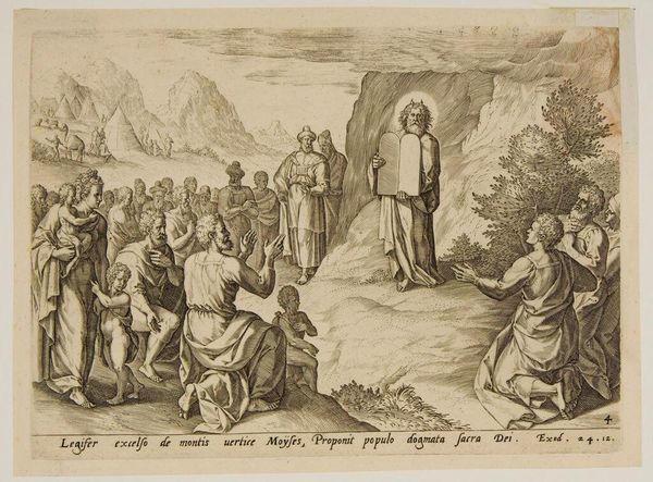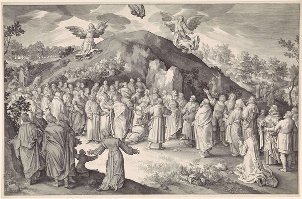 Nicolaes de Bruyn created this artwork titled 'Prediking van de apostelen' or 'Preaching of the Apostles.' Here, the apostles deliver their message to a crowd amidst a serene, wooded landscape. Their open gestures and upward gazes invite the viewer to reflect on divine inspiration. This scene is reminiscent of classical oratory, a tradition that dates back to ancient Greece and Rome, where gestures were codified for specific emotional and persuasive effects. These gestures are powerful in their ability to convey complex ideas and emotions. Consider the upraised hand, a gesture that transcends time and cultures. We find it in ancient Egyptian art, classical sculptures, and even modern political rallies. In each context, it signifies authority, a call to action, or a plea for divine intervention. The subconscious appeal of such gestures lies in their ability to tap into our shared human experience. The act of preaching, as depicted here, becomes a cyclical return to the origins of faith, continually re-enacted and re-interpreted across time.