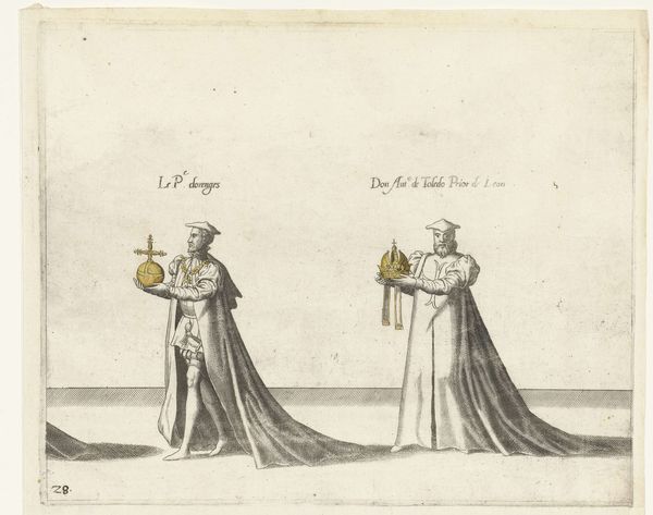 Editor: Here we have "Deel van de optocht, nr. 27," or "Part of the Procession, No. 27," an engraving made sometime between 1559 and 1619 by Joannes van (I) Doetechum, residing in the Rijksmuseum collection. These figures in their elaborate robes seem incredibly formal, almost staged. What story do you think this print tells? Curator: Well, focusing on the materiality, we see an engraving, a process involving skilled labor, mass reproduction, and dissemination of imagery to a broad audience. These are not unique, hand-painted portraits destined for elite patrons, but rather relatively accessible images reflecting and perhaps shaping contemporary ideas about status and power. Editor: So, the medium itself played a role in who saw and understood this image. Curator: Precisely! Consider how printmaking democratized imagery. Prior to such methods, only the elite could afford to view particular ideas. Do these figures represent real people, or archetypes of status during that period, circulating not just amongst nobility but among the rising merchant classes? Editor: I guess it blurs the lines between record and aspirational material culture. Were prints like this influencing fashion or civic roles? Curator: A potent question! These costumes weren't just clothes but represented power and social standing within a rigid hierarchy. These figures become commodities circulating amongst a viewing public who might internalize certain ideologies about society. Does examining the wear of their clothing suggest this image was intended as documentation of real materials, rather than merely idealized impressions? Editor: That makes me look at the image completely differently. Seeing it as a commodity of ideas and influence... I hadn’t thought about the "who" behind viewing practices back then. Curator: Exactly. By shifting our focus to the materiality of the image, we reveal the complexities behind not only the art making itself but also the system through which imagery held material, tangible meaning in culture.