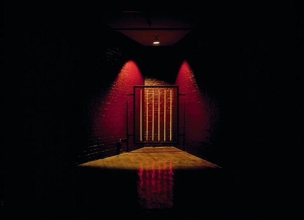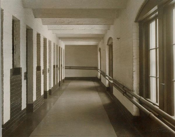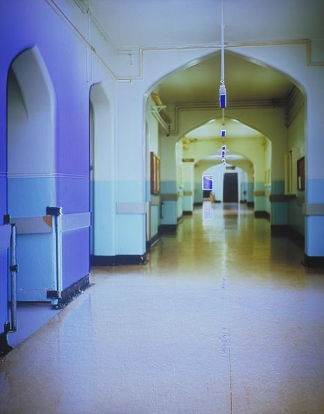 Editor: This intriguing photograph, "Corridors" by Catherine Yass, shows a perspective view of a hallway, playing with disorienting colors. The composition, with its strong central vanishing point, creates a powerful sense of depth. What do you see in this piece formally? Curator: The inverted color palette immediately draws the eye. Note how Yass subverts our expectations, creating a liminal space. The linear perspective converges dramatically, emphasizing the architectural structure. This prompts questions about the nature of space and perception itself. Editor: The inversion definitely changes the mood. I feel like I'm viewing a negative. Curator: Precisely. The artist manipulates form through color, creating a tension between representation and abstraction. Consider how this inversion affects your reading of the space. Editor: It really makes you consider how much color affects perspective. Curator: Indeed. By disrupting the familiar, Yass compels us to examine the intrinsic qualities of form and color.