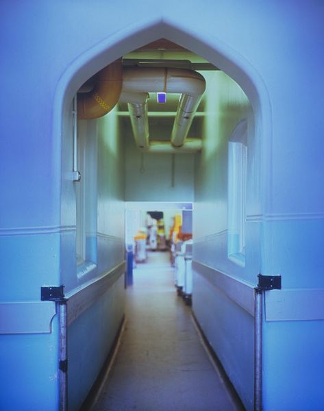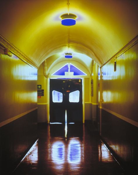 Presented by the Patrons of New Art (Special Purchase Fund) through the Tate Gallery Foundation 1996T07065 Corridors is a series of eight photographic transparencies displayed in light boxes. Featuring mainly luminous blues, greens and yellows as a result of the artist's manipulation of photographic film, they depict interior spaces in a hospital. The photographs are in sharp focus only in the foreground of the image, at the level of the corridor walls, and have been taken with a shallow depth of field. This results in dissolution into more abstracted forms in the areas further away from the camera. In most images this is in the centre, which dissolves into an intense blue glow. Blue light, similar in shade to that of 'Chartres blue', a long-lasting blue stained glass developed in the twelfth century in France for church windows, has become a signature element to Yass's work. Her technique for making images involves taking two photographs of her subject and superimposing them. One is a 'positive' image, the normal form of a photographic image, and the other is a 'negative' image, where light and dark are inverted as on the negative of a photographic print. The photographs are taken within a few seconds of each other. Yass has explained: 'The negative image makes bright areas blue, so bright or transparent areas get blocked by the blue. The final picture is produced by overlaying the positive and blue negative images and printing from that. I think of the space between positive and negative images as a gap.' (Quoted in Adams, p.81.) She has described this gap as 'an empty space left for the viewer to fall into … [resulting in] no limit to prevent the viewer from being pulled right in and being pushed out again.' (Quoted in Adams, p.84.) Yass's first publicly exhibited works, in the early 1990s, were portraits exploring the relationship between the personalities projected and the environments against which they were set. In 1994 she was one of three British artists commissioned by the Public Art Development Trust (a London based charity aiming to promote art and education about art in public spaces) to make a series of images for Springfield Hospital in south west London, a psychiatric institution built in the nineteenth century. She began by looking at photographic research into mental health undertaken at the hospital in the mid-nineteenth century by a local doctor, a Dr Diamond. At that time medical practitioners in the field of mental health were using photography as a tool to classify mental illness according to its physical manifestations. Diamond's portraits of his patients, like those of the famous French neuropathologist and doctor of hysteria, Dr Jean Martin Charcot (1825-93), labelled them under headings of their perceived disability. To subvert this, Yass made six portraits of anonymous hospital inmates and staff without visible indication of their status (whether they were working in the hospital or suffering from 'mental illness'). The photographs used in Corridors were intended as backgrounds to these portraits. Yass became interested in the empty spaces as images in and of themselves, perceiving them as even more disorientating to the viewer without their intended subjects. She uses light boxes to enhance this effect. She has stated: 'The work is not only about the image but also about the light boxes in a physical space. This produces another doubling or turning as the viewer switches between the space of the image and the space they're in. There is a disorientation as they are caught in the gap between them.' (Quoted in Adams, p.87.) The series of eight Corridors was produced in an edition of two, of which this is the first.A further set of four images exists in an edition of four, each of which is unique in its combination. The images each have a subtitle. For this image it is Chaplaincy. Other subtitles are Kitchen (Tate T07066), Daffodil 1 (T07067), Daffodil 2 (T07068), Ash (T07069), Modern Team Base (T07070), Personnel (T07071) and Jubilee (T07072). The images do not have a particular order and may be displayed separately or as a group. Further reading:British Art Show 4, exhibition catalogue, South Bank Centre, London 1995, p.16, reproduced (colour) pp.86-7Parveen Adams, Greg Hilty, Catherine Yass: Works 1994-2000, London 2000, pp.8 and 84, reproduced (colour) pp.19-23, pl.1-8Hospital Projects: Zarina Bhimji, Tania Kovats, Catherine Yass, Public Art Development Trust, London 1995, pp.17-19, reproduced (colour) pp.20-1 Elizabeth ManchesterMarch 2002