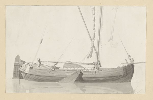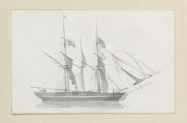 Curator: Before us, we have Hendrik Abraham Klinkhamer’s “West-Indiëvaarder,” a pencil drawing dating from somewhere between 1820 and 1872, held here at the Rijksmuseum. Editor: It’s evocative. It immediately makes me think about trade, labor, and the very real physicality of ships like this that connected disparate places through often exploitative systems. Curator: Precisely. This drawing depicts a ship involved in trade with the West Indies, a crucial element in the Dutch colonial system. Consider the conditions on such a ship, the power dynamics inherent in its purpose. Who was on board, and under what conditions did they travel and work? What materials were being transported and who was profiting? Editor: You see the sparseness of the pencil lines; they're economical in a way, aren’t they? Think about what it meant to produce ships, the skill, the extraction of resources, the shaping of the wood… It was arduous labor for many involved and yielded wealth for the few, underscoring colonial extraction's human and environmental costs. The ship itself embodies that duality of connection and exploitation. Curator: Absolutely. And that’s where situating this artwork within a broader social and political framework is critical. How do we confront the legacy of colonialism embedded within the image, within the ship’s very existence, even today? The journey the ship took would have transported enslaved people and goods plundered from indigenous populations in lands it would reach. Editor: I agree. To analyze just the artistic quality of the drawing in isolation is inadequate. We must interrogate the physical labor embedded in producing ships like these, extracting the wood, forging the metal – it tells its own story. It pushes us to consider its function within colonial networks of material exchange and exploitation. Curator: Ultimately, it challenges us to decolonize not just our gaze, but also the historical narratives we construct around these objects, and understand their continued resonance. Editor: Yes. Looking at this drawing helps visualize these processes in material terms. The skeletal nature of the image gives us direct access to this analysis.