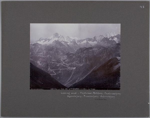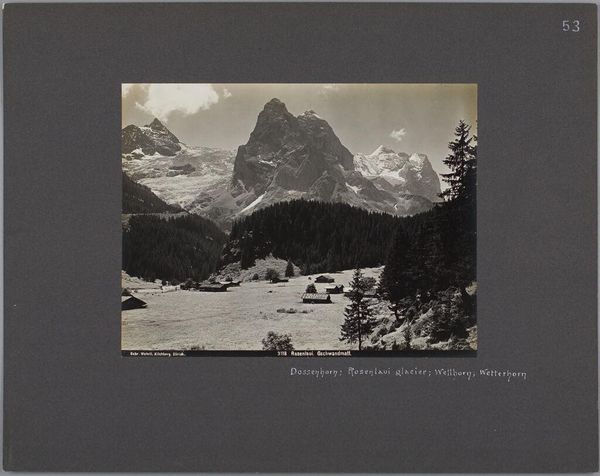 Curator: This is "From above the Sulden Hotel; Königspitze is S. by W.", a photograph by the Bachrendt Bros., currently residing at the Harvard Art Museums. The image size is about 20 by 26 centimeters. Editor: It has a striking, almost severe beauty. The stark contrast between the dark pines and the snow-capped peaks creates a really dramatic composition. Curator: Absolutely. We see a clear attention to materials here. The photographic process itself, the developing and printing, has produced this particular range of tones. The labor involved in creating such an image in a remote location also needs recognition. Editor: And consider the socio-political backdrop. Tourism to these regions was becoming increasingly popular, influencing both local economies and the way landscapes were perceived and commodified. This image then becomes a document of that specific moment in time. Curator: Precisely. Thinking about the choices made in production can reveal how the Bachrendt Bros. shaped the experience of this landscape for their viewers. Editor: Seeing this photograph makes me think about how photography, then and now, influences our relationship with nature. Curator: Yes, it highlights how the medium itself can shape perceptions. Editor: It has certainly given me much to consider about our interactions with landscape.