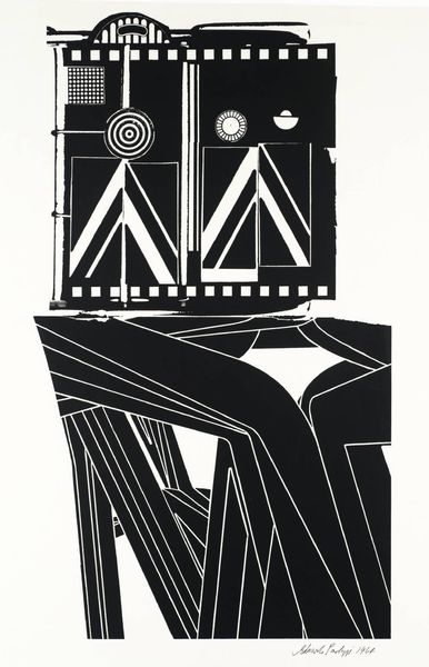 Editor: This is "Girot and Plaza" by Eduardo Paolozzi. It’s graphic and the black and white contrast is so striking. What symbols do you see at play here? Curator: Notice how Paolozzi layers machine-age and geometric symbols, evoking the rapid changes of the modern world. The circles, squares, and triangles might be interpreted as building blocks of a new, sometimes disorienting, reality. Do you see any repeating motifs? Editor: I see lots of circles and lines, almost like blueprints. So it’s about industry and progress? Curator: Perhaps, but consider the unsettling juxtaposition of these elements. Is progress always harmonious? The fractured composition hints at underlying anxieties. Editor: That's a great point. The chaos does feel intentional, complicating the message. Curator: Exactly. The visual vocabulary reflects our complex relationship with technology. It shows both promise and peril. Editor: Seeing it as a commentary on progress helps clarify his intent. Thank you. Curator: It's been a pleasure to discuss how Paolozzi uses potent symbols of technology and progress.