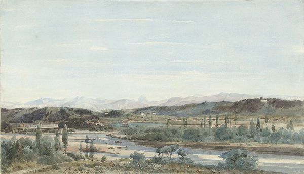 Curator: Lockwood de Forest's "Greek Mountain Peak at Twilight," painted around 1878, is just glowing with a subdued inner light. There's a kind of whispered peace about it. What's your first impression? Editor: Austere. Look at that texture, though—you can almost feel the coarse grain of the paper itself pulling against the brushstrokes. The visible process really interests me here. Curator: Yes, it does have that sense of raw immediacy, doesn’t it? It's watercolor and oil on paper, a real mix, allowing the whiteness to peek through. The light just hangs in the air. Did he paint it outdoors, I wonder, just as the day softened? It’s so fugitive, the light—almost gone. Editor: I suspect that “plein air” quality isn’t accidental. Consider how the pre-mixed paint tubes, becoming widely available around this time, liberated artists to venture beyond the studio. They allowed this immediate interaction with landscape that seems to so enchant you. Curator: Enchant is absolutely the word! See how he's layered washes, almost translucent, building up that subtle colour? I see dusty pinks in the sky, a soft transition into the palest blue, reflecting on the mountains themselves. The mountain peak—a dark brooding presence against that gentle fading light... Editor: The mountain might feel less brooding and more monumental, you know, when we situate its presentation within a burgeoning tourist industry eager to create visual tropes of Greek grandeur for international consumption. This could be a sales brochure in high art’s clothing, in some senses. Curator: Ouch. Though it *is* hard to deny the inherent drama in landscapes like this. Perhaps a commission, a prompt? But look again at those freely sketched rocky outcrops in the foreground! They feel very personally observed, immediate somehow... And those greens, the merest hint of life, like a memory almost of the day. It truly speaks to the passage of time and evokes an atmosphere I know. Editor: Agreed—De Forest definitely understood how to work materials and light to manufacture mood. What stays with me, though, is not just the romanticism of the scene but that the physical object reflects an interaction with growing industries related to landscape tourism. Curator: That tension adds a certain… grounding. This "Greek Mountain Peak at Twilight" seems, upon reflection, both dream and document. Editor: Yes, art objects as both records and refractions.