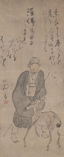 Curator: This intriguing ink and color on paper work, titled "Haiku Poet Shohaku", comes to us from the early 19th century and is attributed to Yokoi Kinkoku. I am struck by the confident lines; the figure seems almost buoyant. Editor: It certainly has an immediate levity. The composition, with the figure centrally located and surrounded by text, creates an interesting visual rhythm, and I’m fascinated by the artist’s choice to portray the poet in what seems to be an informal and intimate manner. Curator: Consider the materials, though: ink, light pencil work and watercolor on toned paper. It suggests an accessibility of production; materials available to the scholar or wandering artist. There's an intimacy conveyed not just in the informality you mention, but in the very making of the work. This wasn't an academic oil on canvas; this was a more spontaneous, personal engagement with the subject. Editor: Agreed. And yet, notice how Kinkoku employs traditional brushwork to define the figure's robe and facial features. The varying ink tones create depth and volume. The red seal, in the lower right, also anchors the composition. The use of negative space draws your attention to Shohaku’s expression – one of serene contemplation, perhaps. Curator: Exactly. Think about the social context. Haiku, even then, represented a blending of high and low culture. The sketch isn't reverential; there's a distinct lack of grandiosity. We glimpse Shohaku perhaps as Kinkoku encountered him – an artisan among artisans. It invites us to reflect on what art truly values and memorializes. Editor: I appreciate that insight. Looking at it formally, the use of the calligraphic text becomes an intrinsic design element rather than simply descriptive annotation, interacting with the visual portrayal, to create this sort of cohesive semiotic dialogue. The character itself seems almost to emanate from the inscription; together text and image articulate character. Curator: Precisely. In examining the material simplicity, in recognising the conditions in which this piece was probably created and received, we perhaps value differently what Shohaku’s haiku once meant. It's no longer a 'precious object' alone; but a historical document rooted in collaborative cultural labor. Editor: So true. It reframes our reading experience, shifting from aesthetic appreciation to informed engagement. Curator: Indeed. This is more than just a portrait; it is an invitation to reflect on the production of culture and its potential democratization. Editor: Well said, a fitting synthesis of form, expression and making of art.