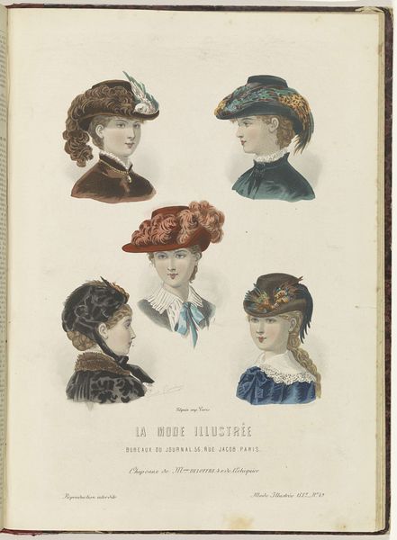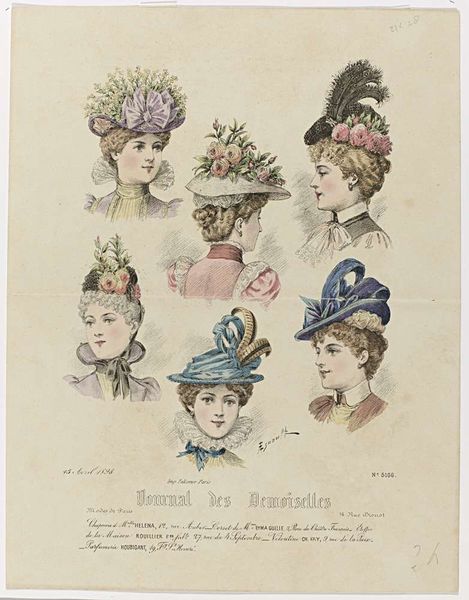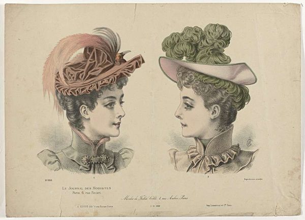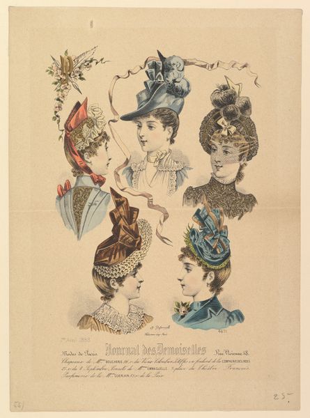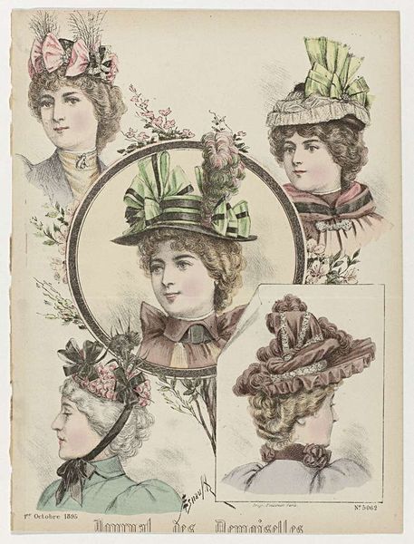 Editor: This is a page from "Journal des Demoiselles, 1 octobre 1886," an ink and print piece showcasing fashion designs by P. Deferneville, brimming with Art Nouveau flair. I am instantly drawn to the hats; they're incredibly ornate and seem to defy gravity. How do you interpret the cultural significance of such a piece? Curator: Ah, yes, my dear. It's a glimpse into a world obsessed with elegance and detail, isn’t it? It whisks me back to Parisian salons filled with hushed conversations and the rustling of silk. What strikes me is the sheer… architecture of those hats. They're almost like miniature buildings perched on the heads of these demure women. Can you imagine trying to navigate a doorway with one of those creations? Editor: I can't! They seem so impractical for… well, life! But I guess practicality wasn't the point? Curator: Precisely! It's about signaling status, taste, and a certain detachment from the everyday. It’s pure theatre, darling. The image has a wonderful tension between mass production--being a published print--and these handmade exclusive aspirations of the fashion. I wonder, what kind of woman do *you* imagine wearing one of these incredible contraptions? Editor: Someone bold, confident, but maybe a little bit constrained by social expectations. It makes me wonder about the role of fashion then – empowering or restrictive? Curator: It's both, of course, isn't it always? It’s a constant negotiation between self-expression and conformity. What do *you* think she's thinking? About social power, romance, or simply impressing the neighbours? The artist almost seems to ask the question as we gaze into each women’s face in profile. Editor: I never considered how much a fashion plate could reveal! Curator: These images are historical documents--visual whispers from another time that speaks volumes of beauty and its relationship to status! It invites us to listen to an imagined voice, isn't it fantastic? Editor: Definitely a new perspective on "fashion illustration" for me!