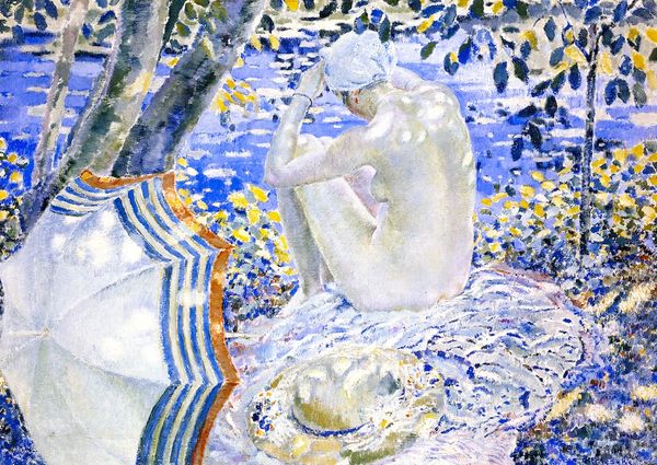 Editor: We're looking at "Vase of Flowers (dark colors)" painted in 1956 by Spyros Papaloukas. It feels quite abstract; at first glance, almost indistinct. It has this dreamy, ethereal quality because of the light colors that somehow feel heavy at the same time. What stands out to you about this piece? Curator: The composition certainly departs from traditional still life. Note how the form is dissolved into a mosaic of colour. It begs the question: are we truly perceiving the vase and flowers, or rather an impression, a memory of them? Editor: A memory, that’s interesting. I was so focused on the vagueness that I forgot it represents something tangible! Curator: Precisely! Consider how the brushstrokes operate. They function independently and collectively, don't they? Individually, each stroke is a burst of color and tonality, almost impulsive. Collectively, they construct a cohesive, albeit blurred, image. Editor: So, you're saying the beauty isn't in the realism but how the colors interact and build upon each other. Like how blue complements orange… Curator: Precisely. One might delve into a structuralist reading, perceiving the artwork as a linguistic system where colour acts as a signifier, creating a symbolic language for the floral subject. Editor: It’s a far cry from my initial impression. I'll definitely be rethinking how I approach abstract works going forward. Curator: And I, in turn, will reflect more on the emotional response abstract pieces can evoke.