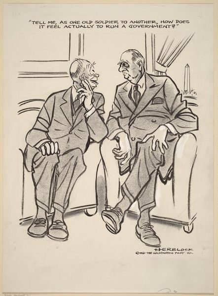 Editor: This drawing from 1959 by Herbert Lawrence Block is titled "Eisenhower and Khrushchev." It's a pen drawing that strikes me as very… satirical. What do you see in this piece? Curator: Absolutely, the caricature is strong! This drawing captures a moment of tentative hope during the Cold War. Beyond the immediately visible elements of satire and the likeness of these powerful leaders, it’s important to look at the narrative Block constructs about power dynamics. He seems to comment on the manufactured image of camaraderie for political gain. How might you read the expressions on the faces of the people in the background? Editor: They seem sort of uniform, almost like a backdrop instead of individual people. Do you think Block is trying to say something about the performative nature of political rallies? Curator: Precisely! The uniformity flattens them, obscuring their individual voices. By juxtaposing the seemingly enthusiastic crowd with the almost cynical expressions of the leaders, Block critiques the spectacle of politics. Consider the Washington Monument in the background, too; how does it add to the symbolic weight? Editor: It grounds the image in a specific American context, right? Almost reminding the viewer of the principles at stake during this period? Curator: Exactly. Block cleverly uses these visual elements to make us question what's genuine and what's carefully constructed. He really challenges us to think about the stories leaders tell and how those narratives impact us. Editor: I never thought about it that way, but that totally changes how I see the drawing! The smiling faces, the waving hands… it's all a facade. Curator: It really underscores how effective visual art can be as a tool for social and political commentary, and it prompts reflection even decades later.