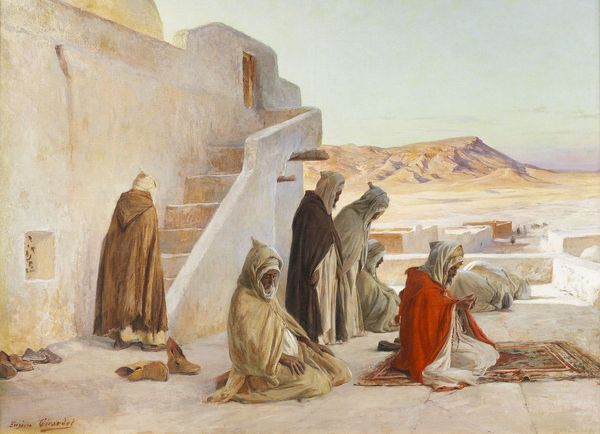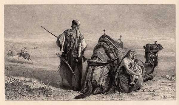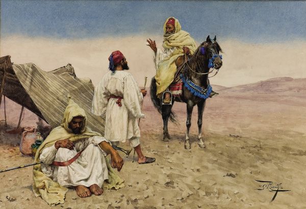 Curator: Here we have Carl Haag's 1867 watercolor and gouache painting, "Danger in the Desert." It's currently held in a private collection, and offers a window into both the artist's skill and a Western fascination with the East. Editor: My immediate reaction is, tension! This arid landscape, bleached by the sun, immediately conjures up that sense of vulnerability. It also has that uncanny, calm-before-the-storm quality about it, especially when considering the oncoming rider... Curator: Indeed. The composition cleverly juxtaposes elements of security with immediate threat. You've got the seated woman with a child near the camel, beside what seems to be her husband guarding the rear. But is that rider approaching? Is that a battle that is on the precipice of erupting? Editor: Exactly, and consider the symbols themselves. The camel, often associated with endurance and provision in harsh environments. The firearm could symbolize conflict, while the seated mother and child introduce elements of domesticity. This creates an intersection between these really opposing forces. The spear or lance of the incoming figure reminds of ancient codes and tribal conflicts. Curator: Right. The romantic undertones in this "Orientalist" piece evoke an intriguing contrast, reflecting a world both familiar and alien. These are also, though, human representations of that world; they evoke very little mystery. And let's not forget Haag's command of watercolor—the way he captures the stark desert light is just amazing. Editor: You know, seeing that shisha on the carpet adds a surreal element, anachronistic as though it has landed straight out of an episode of time travellers into ancient times. It also contrasts sharply with the rider, the dust and grime, the immediate sense of risk. This tension—this constant visual argument—holds my interest. Curator: Ultimately, the work poses so many interesting questions about perspective, representation, and the very human urge to interpret the unknown. Editor: Absolutely, a thought-provoking journey through color, contrast, and the human spirit, or a Western's projection of it.