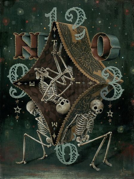Jason Limon painted "Reflection" with oils on panel, achieving a tactile and visually engaging surface. The artist’s technique, reminiscent of classical painting, ironically portrays a subject matter associated with mortality: skeletons constructing a house of cards. The choice of oil paint allows for a richness of color and depth, evident in the aged and cracked texture of the cards, and the rendering of light on bone. Limon skillfully balances the fine details of the skeletons with the more graphic, almost commercial design of the playing cards. The house of cards, precariously built, symbolizes the fragility of human endeavors. The labor-intensive process of painting emphasizes the contrast with the fleeting nature of life and the ultimate futility of material constructions. The artist elevates this reflection on mortality by engaging in a time-honored medium, suggesting that artistic creation, unlike life, can endure. This tension invites us to reconsider traditional hierarchies between high art and other, more ephemeral forms of creative expression.