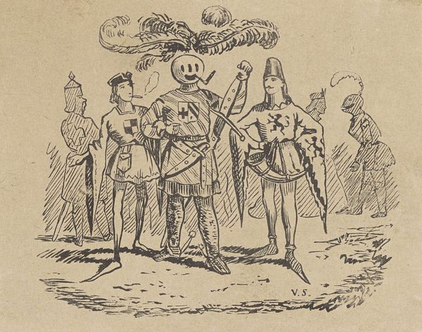 Curator: This caricature, a graphite and engraving print titled "Spotprent op de Duitse keizer Wilhelm I," which translates to "Caricature of the German Emperor Wilhelm I", dates back to 1862 and was created by Johan Michaël Schmidt Crans. Its original publisher is credited as B.A. Thomsen and Martnus Nijhoff. Editor: It's startling how stark and almost brutal the lines are. Even without knowing the context, I get a feeling of oppression and enforced servitude just from the artist’s choice of such hard edges. Curator: Indeed. The symbolism here is heavy. The print shows Wilhelm I being carried aloft on the backs of bowed figures, while soldiers with fixed bayonets stand guard. A banner proclaims "Kaiser" or Emperor while bearing the scrawled text "constitution". What is the symbolism speaking to? Editor: It suggests a commentary on power, absolutely. It challenges the idea that power comes from the people. We know Wilhelm I had significant conflicts with the Prussian Parliament in the early 1860s regarding military reforms. The cartoon is critiquing Wilhelm I's view that his legitimacy stems from the military might— "de Genade… des legers" – which means "by the grace of… the army" as written in the caption. This would resonate strongly with anyone feeling disenfranchised. The inclusion of the army also alludes to the strength with which Wilhelm sought to achieve the "Unification of Germany". Curator: Observe, too, the physical weight conveyed through the figures. Those who support Wilhelm—presumably the nobility and military—are rendered with a kind of bloated physicality. Conversely, the bowed figures are caricatured as contorted under an invisible, heavy, inescapable reality of enforced submission, evoking religious scenes such as “Christ carrying the cross” in the manner in which those underlings must provide comfort to those above. Editor: It's interesting to see how art becomes a mirror reflecting social anxieties. That sense of unease or instability is clearly on display through Johan Michael Schmidt Crans' sharp satire here, reminding us that caricatures often reveal more truth than official portraits. Curator: Exactly. Caricatures operate as a powerful means for processing difficult, sensitive historical moments. Thank you for illuminating the historical forces at play with this image. Editor: And thank you for unveiling the artistic symbols used by Schmidt Crans to reflect that particularly volatile period in Germany.