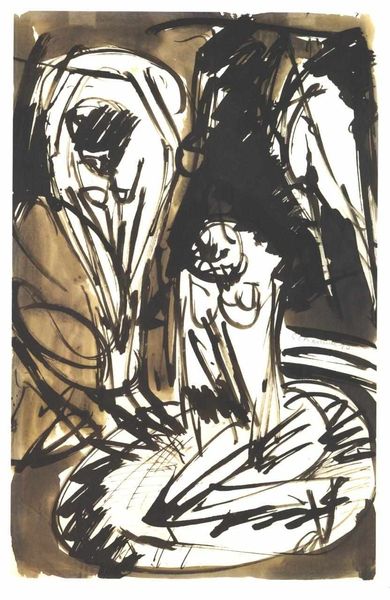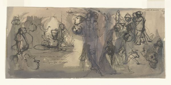 Curator: This ink drawing, titled "Herre og dame foran en balustrade," which translates to "Man and woman in front of a balustrade," is attributed to Jürgen Ovens. It's believed to have been created sometime between 1623 and 1678. Editor: Immediately, I see two figures rendered with quick, confident strokes of sepia ink. There’s a real immediacy to it; it almost feels like a fleeting impression. It is also somehow damaged or marked on its upper side; these blurred zones are distracting to me. Curator: The beauty of drawings like this lies in their intimacy. We're witnessing the artist's process, a glimpse into their visual thinking. Editor: Absolutely. The way Ovens uses the varying thickness of the lines—look how delicate they are around the woman's face compared to the man's cloak—it really animates the scene. Do you think that contrast enhances our perception? Curator: I'd say so. Consider the context—Ovens was working during the Baroque era, where drama and movement were paramount. He conveys volume, not with color, but through tonal contrast alone. This drawing would likely have been part of a larger preparatory process. Perhaps sketches toward a more realized portrait. Editor: Right! Perhaps destined for something far grander, but here it's all energy, all suggestion. In its raw state we feel its humanity and that sense of captured life. But for who were they destined? Were these the times of portraits only for wealthy bourgeois? Curator: Portraits like these reinforced the social hierarchy of the period, displaying wealth and status. The choice of setting, with the balustrade suggesting a sophisticated environment, all contributed to the creation of a specific image. That level of detail is pretty interesting from a social history viewpoint. Editor: For sure. I wonder too what details and stories these marks and water staining could tell. Imperfections are always interesting. They hint a life before our viewing. And beyond the social messaging of such portraits, I cannot deny its vitality. A stolen, silent moment from another era. Curator: Exactly. These sorts of works offer insights into the cultural codes embedded within representations of people, power, and the theater of everyday life in a specific moment. Editor: I find the raw humanity thrilling! A brief glimpse across the chasm of time. I'm content just now being near these people and feel their simple, beautiful and fleeting emotions, in that strange and silent place that never ages!