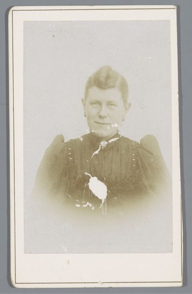 Editor: Here we have "Portret van Aaltje Koster", a photographic portrait dating from somewhere between 1889 and 1925, created by Josephus Hendrikus Petrus Coppens. It feels so incredibly formal, almost frozen in time. What strikes you when you look at this image? Curator: Ah, yes, Aaltje Koster. Isn't she something? This photograph whispers of quiet dignity, doesn’t it? Makes me wonder, what was a day in her life like? What secrets did those eyes hold? In terms of composition, look at the careful balance, the subdued tones, the deliberate pose. It’s realism, yes, but with a touch of, dare I say, the romantic. It's about capturing not just what she *looked* like, but perhaps hinting at who she *was*. Editor: That's beautifully put. I hadn't considered the "romantic" element within realism. So, beyond just documentation, what might Coppens be trying to convey? Curator: Perhaps he wanted to immortalize Aaltje, to give her a presence that would outlive the ephemeral nature of human existence. In a way, photography was becoming a new kind of memory-making in those days. I wonder if Aaltje chose that specific dress. Also, you see that pin on her chest? These tiny details help build up, almost, a complete person! The photograph then becomes almost like a time capsule... Do you see what I mean? Editor: Absolutely, the detail adds another layer! It goes from a simple portrait to a snapshot of a life. It makes me wish I knew her story! Curator: Precisely! And isn't that the magic of art? It ignites curiosity, prompting us to fill in the gaps and connect with the past on a personal level. Editor: I will definitely look at other photos with new eyes from now on! Thank you so much.