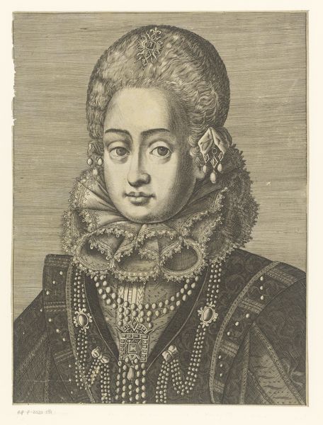 Curator: Looking at this portrait of Maria of Bohemia, conceived by Frans Huys between 1546 and 1562, it’s hard to ignore the historical narratives it invites. This engraving situates her within the dynastic complexities of the 16th century, representing power, nobility, and womanhood within very specific constraints. Editor: My immediate impression is one of muted opulence, despite the black-and-white medium. There is an elegance and reserve communicated through the textures of the clothing, the jewelry, and even the delicate lines used to shape her face. Curator: Indeed. Maria of Bohemia was not just any woman; she was a queen, and daughter of Emperor Charles V, so understanding how gender and power intersected for her is crucial. Consider the deliberate choices in her attire and pose – symbols crafted to project an image aligning with her royal status and perhaps subtly asserting her position within a patriarchal structure. Editor: The symbolism here feels very direct. Her attire serves almost as a symbolic language, no? For instance, the heavy ornate necklace surely signifies both wealth and status. There’s also something very careful in how she holds her hands – a gesture suggesting humility perhaps but also, considering it visually supports the family medallion, a pride in her lineage? Curator: Precisely. And consider the politics of image-making itself at the time. Royal portraits were tools for propaganda and diplomacy. How might Maria have exerted agency – or been denied it – in how she was presented to the world? The intersection of gender, class, and representation is so palpable. Editor: Looking closely at this representation of Maria and thinking about later eras, her gaze doesn’t engage with the viewer directly but is turned ever so slightly away to the side. Does that have a psychological purpose? Maybe indicating detachment and self-reliance. Also, I am curious how viewers at the time interpreted her representation as fitting her historical memory? Curator: These are pivotal questions to pose, encouraging us to think critically about power dynamics then and now. Editor: This portrait reveals not just a queen but a carefully constructed identity caught between visibility and constraint. Curator: It invites a crucial understanding about identity, gender, power and privilege through visual representation of a notable noble woman.