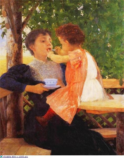 Joseph DeCamp painted "The Hammock," a domestic scene, likely in the late 19th or early 20th century. This work reflects the increasing emphasis on family and leisure time that emerged alongside industrial capitalism in America. The mother and children relaxing in a hammock suggest a moment of tranquility removed from the bustle of urban life. DeCamp's soft brushstrokes and bright colors evoke a sense of warmth and intimacy but it is also worth noting who is missing. Where is the father? We see here the dawning of a new American ideal, where mothers are solely responsible for the wellbeing of children. To fully understand this painting, it is helpful to consider the rise of the middle class, the development of suburban communities, and the evolving roles of women in American society during this period. Art historical databases, period publications, and biographical information about the artist can shed light on the cultural and social context in which this painting was created.
