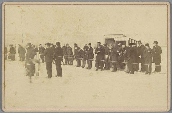 Curator: J. H. Adams' photograph, titled "Immigrants Admitted, About to Board a Barge For Railroad Terminals," captures a pivotal moment at the New York immigrant station. The image itself is quite striking, yet muted in tone. Editor: It’s a sea of hats and heavy burdens. You can almost feel the weight of expectation—and exhaustion—hanging in the air. There’s a somber quality, don’t you think? Curator: Absolutely. The photograph offers a glimpse into the institutional processes of immigration, specifically the regulation and admission of newcomers at the port of entry. Editor: And yet, beyond the historical document, I see resilience. Each person with their meager belongings, embarking on an unknown chapter. It stirs up a strange mix of empathy and awe. Curator: Indeed. Adams' photograph serves not just as a record, but as an invitation to consider the human stories woven into the grand narrative of immigration. Editor: It makes you wonder about their dreams, their fears, what America held for each of them. A simple image, but it echoes with the complexities of hope and displacement.
