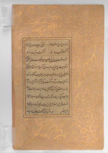Curator: We're looking at a folio from a Shahnama, or Book of Kings, created in the 16th century. This drawing in ink on paper, titled "Fifth Joust, The Death of Simurgh by the Hands of Isfandiyar," depicts a pivotal scene from the Persian epic. It now resides at the Metropolitan Museum of Art. Editor: My first impression is one of intricacy. Even without understanding the Farsi text surrounding the central image, I’m immediately drawn to the ornate borders, which set a rich, almost melancholic tone for the visual story being told within. Curator: The image itself is a miniature painting, a hallmark of Islamic art. Isfandiyar, a legendary Iranian hero, is shown slaying the Simurgh, a mythical bird. Iconographically, the Simurgh is more than just a bird. It represents ancient wisdom and, in some contexts, even divine grace. Its death at the hands of Isfandiyar marks the loss of something profound within the narrative. Editor: That is fascinating, and contributes to the visual drama that unfolds on the page. The hero’s pose—so decisive and violent—is made even more poignant knowing what the Simurgh represents. The stark contrast between the detailed rendering of Isfandiyar, and the almost dream-like quality of the Simurgh, suggests the clash between human will and something greater, almost unknowable. Curator: The choice to depict this specific moment, “the death of,” reveals a particular socio-political stance on power and its cost. The artist, through this selected narrative, shows the hero sacrificing knowledge or intuition in pursuit of a kingdom. It speaks to the choices leaders face and the sacrifices made for power, a timeless theme explored through the visual symbols. Editor: The muted colors amplify the sense of loss and the weight of destiny that pervades the story. Even the calligraphy, presented in neat columns, acts like a visual anchor, lending further seriousness to this tragic episode. It all coalesces into a striking commentary on the human condition. Curator: It’s a powerful reminder that art doesn't just reflect history, but shapes how we remember and interpret it, with symbols and stories constantly evolving through political and social context. Editor: Indeed, and by looking deeply into visual emblems, like the Simurgh, we can still perceive a resonance and a memory today, even across time and cultures.