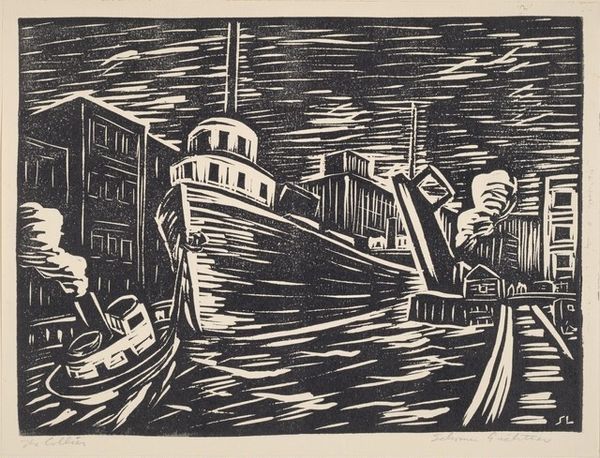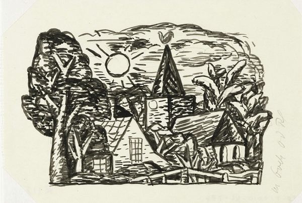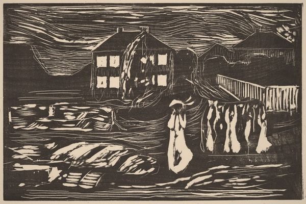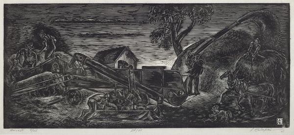 This is Santa Fe Landscape, a woodcut print by Alfred Gwynne Morang. It's all in black and white, which isn't really about accuracy, it's more about feel, and process. The carving feels deliberate but gestural, with each mark precise yet raw, forming the landscape. The composition, with its tilted horizon and simplified forms, gives it a kind of naive, outsider quality. Look at the foreground, where the lines carve out a tangle of vegetation. There is a real dynamism there, almost like abstract expressionism. It reminds me a bit of some of the American Modernist prints being produced at the time, like those by Rockwell Kent, but with a slightly less polished, more handmade quality. It’s less about a perfect image and more about the act of making.