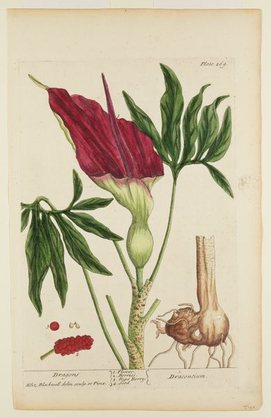 Curator: What a striking composition! The crimson petals of the Mullein Pink almost vibrate against the neutral background. Editor: This botanical drawing by Herman Saftleven, dating back to the 17th century, captures the plant at the Harvard Art Museums. It's a delicate piece, only about 20 by 16 centimeters. I find it very quaint. Curator: Notice how Saftleven renders the texture? The subtle variations in the application of color and the stippling effect on the leaves generate an exceptional tactile sensation. It draws you in. Editor: Botanical drawings like these were often commissioned by wealthy patrons. They represented not only an interest in the natural world but also the power to collect and classify it. Think of it as an early form of scientific illustration, influenced by colonialism and global trade. Curator: Certainly, but consider the inherent formalism. The strategic placement of the blossoms, their curvature and relation to the stem, is a study of natural geometry. Editor: Indeed. It's a moment of stillness, reflecting a period eager to understand, document, and control nature.