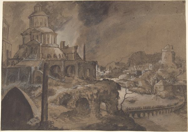 Editor: This is Herri met de Bles' "The Temptation of Saint Anthony," painted sometime between 1550 and 1560. The devilish imagery feels pretty intense. It is dark but full of life. It's like Hieronymus Bosch light. What do you make of this wild scene? Curator: Ah, a delightful descent into the delightfully bizarre! This little jewel box overflows with symbolic chaos. Notice the miniature figures scattered amidst the fantastical architecture and landscapes. It’s a fever dream rendered in oil paint. Met de Bles, nicknamed "the Owl" for the little signature bird he hid in his works – sneaky devil! – embraces the Mannerist love for exaggeration. But look closer – what characters strike you? Editor: That giant, disembodied head with the open mouth is pretty disturbing. I wonder what that means? Curator: Isn’t it marvelous? It evokes both the grotesque and the absurd. Maybe it symbolizes the mouth of Hell, devouring souls. Or perhaps it simply represents the cacophony of temptations that assault Saint Anthony's senses. What about the burning city on the left? It's visually striking but also a bit unsettling, no? Editor: Yeah, it definitely looks apocalyptic. Is that symbolic of the temptations overcoming him? Curator: Exactly! The flames represent lust and worldly desires engulfing the saint's surroundings. Yet, he perseveres! The key to paintings like these is to appreciate how personal the symbolism and reading can be, what whispers to your own soul, even centuries later. And did you notice, amidst the burning cities and monstrous heads, even a small owl hiding in the architectural fantasy? Editor: Whoa, that's so cool! I totally missed that. I love how a seemingly straightforward religious scene has so many layers to peel back. Curator: Exactly. It’s an invitation to get gloriously lost in the details, like a little visual treasure hunt. We often think we know stories by their titles alone! It's really taught me to dig a little deeper, metaphorically speaking, but visually, too.