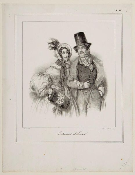 Editor: This is "Show Costumes" by Paul Gavarni. I’m struck by the detail in their clothing; it looks so time-consuming to produce. What do you see in this piece? Curator: I see the artist highlighting the commodification of theatrical labor through the costumes. Consider the process: from the raw materials to the skilled labor of seamstresses and tailors. These costumes weren't just aesthetic; they were products. Editor: So you're saying Gavarni is drawing attention to the economic side of theater production? Curator: Precisely. It prompts us to think about the consumption of entertainment and the labor that goes into it. How does this contrast with our view of ‘art’? Editor: I guess I never considered clothing as such a product! It definitely gives me a new perspective. Curator: Indeed. This work underscores how art is embedded within larger systems of production and consumption.