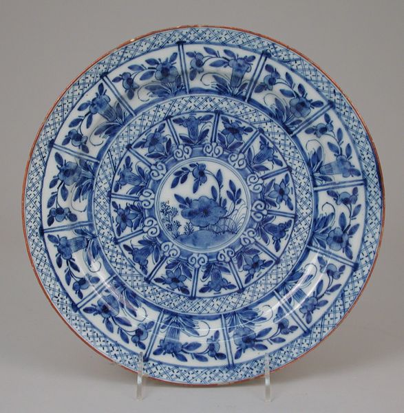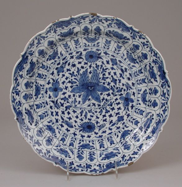 Editor: Here we have a ceramic platter, likely dating between 1700 and 1720, created by Rouen Potteries. I am struck by how ornate the decoration is, but with a very limited color palette. What cultural echoes do you see in this piece? Curator: The prominent blue and white, and the symmetrical designs are definitely channeling Eastern motifs. Though created in France, it draws heavily on the symbolic language of imported Chinese porcelain, immensely popular at the time. Notice the almost calligraphic nature of the floral patterns. Do you see how the center medallion acts as a focal point, almost like a mandala in its intricate repetition? Editor: I do. It almost feels like it is inviting contemplation, and I'm guessing that feeling was quite intentional? Curator: I would argue so. Ceramics like these were signifiers of wealth and taste but, also, became potent symbols in asserting social identity. This seemingly decorative object reveals much about cultural exchange, imitation, and adaptation during a specific historical moment. What kind of narratives do you think these symbols convey? Editor: It makes me think about the complexities of trade and the desire for exoticism. It’s interesting to think that a platter can speak to such intricate and powerful themes! Curator: Precisely! By examining visual symbols we see reflections of cultural memory. Hopefully, we understand just how interwoven historical narratives can be!