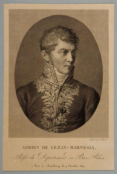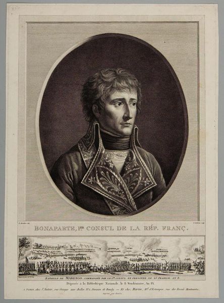 Editor: Here we have Francesco Bartolozzi’s rendering of Napoleon Bonaparte. The intricacies of the uniform suggest that the process was laborious. What can you tell us about the means of its production? Curator: It is the labor that defines Bartolozzi's image. Consider the engraver's painstaking work, a form of mass production for portraits of the elite. This challenges our notions of "high art" when we think about the means of circulation and the market for such images. Editor: That's a fascinating point about mass production. It really reframes how I see this image! Thanks. Curator: Indeed, materiality and circulation give artworks their cultural weight.