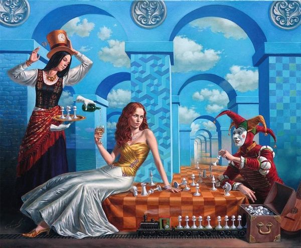 Art Historian: We’re looking at “Covert Fruits of Enlightenment” by Michael Cheval. This piece employs a fascinating blend of realism and surrealism, typical of Cheval's oeuvre, I'd say. Artist: My first impression? Intriguing. Melancholy, maybe? The bubbles feel delicate, fragile. And the composition is wonderfully weird, the odd objects give an unexpected grounding—a very light, almost whimsical touch to serious themes of self and deception, doesn’t it? Art Historian: Indeed. Bubbles themselves are rich in symbolism—ephemerality, illusion, the transient nature of existence. Notice the figures intertwined with the landscape, that Harlequin figure emerging from what seems like petrified wood. His image and actions are reflected on children on the lower corner of the piece. Those types hold potent significance in the commedia dell’arte tradition and act like guides—mediators between worlds. Artist: He's creepy! Yet, compelling. Guides, or perhaps a distorted, hidden inner critic? The harlequin’s shadow falls onto the child. Also note the items beneath the table: they seem out of time, disruptive...a hairdryer, an iron...are they evidence of modern intrusions into this seemingly antiquated world? Art Historian: Precisely. They could represent suppressed or dismissed aspects of modern life, adding a layer of concealed complexities beneath a veneer of conventional beauty. Or perhaps those are tools used in shaping feminine expectations across eras: vanity, household upkeep, domestic routine. There is tension that seems familiar across time periods. Artist: It’s all these dualities, layered symbols within symbols, that pull you in. It’s as if Cheval’s whispering, “Look closer. Nothing is ever truly as it seems,” with just a bit of darkness and wryness mixed in, no? The woman is both contained and liberated in the act of making bubbles. Art Historian: It is indeed a commentary on our perception versus reality. What fruits does enlightenment offer? Perhaps illusions revealed? Artist: I find the whole image a riddle. That's art though. That it provokes introspection and doesn't hand you easy answers. Art Historian: Well, this has definitely expanded my awareness today! The layered imagery offers sustained intrigue about the symbolic world all around us.