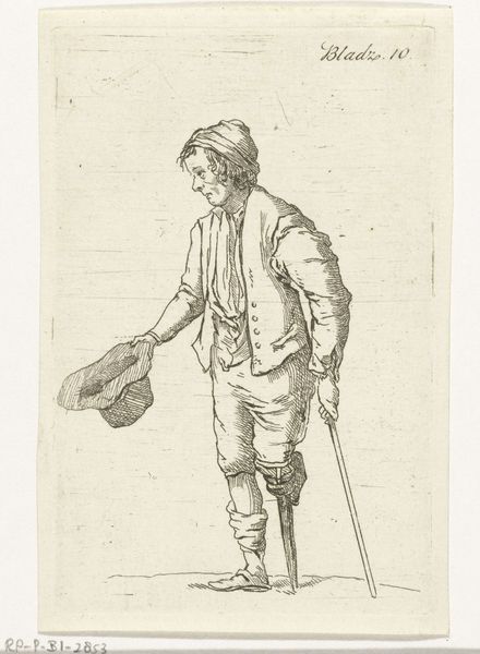 Editor: This drawing, “Staande man, op de rug gezien”—“Standing Man, Seen from the Back”—by Jordanus Hoorn, made sometime between 1763 and 1833, is rendered in delicate pencil strokes. It's interesting how the artist chose to portray the figure from behind, almost like a fleeting glimpse. What draws your eye, looking at it? Curator: It's the intimacy, wouldn't you agree? We're positioned almost voyeuristically, peering over the artist's shoulder into their sketchbook. I imagine Hoorn quickly capturing someone who caught his eye, perhaps while musing on mortality or merely observing the mundane beauty of everyday life. The lines are simple, direct, not fussy...they speak of immediacy, like a half-remembered dream. What do you make of his posture, the way he leans on his cane? Editor: There's a casualness to it, definitely. He doesn’t seem posed or staged, more like he's just… there. Perhaps contemplative? Is this an element of romanticism, maybe? Finding beauty and significance in the common man? Curator: Precisely! Romanticism delighted in the individual experience, the quiet drama of being human. The back view is clever, in a way. We are invited to project our own narratives onto this anonymous figure. He becomes a blank canvas for our own reflections, a mirror to our internal landscapes. Does the sketch evoke a specific emotion or memory for you? Editor: I suppose there's a sense of melancholy to it, perhaps from the muted tones or the solitary figure. It definitely sparks a feeling of introspection. Curator: It's marvelous, isn't it, how a simple sketch can unlock such depths? Hoorn offers us a portal not only into the past but into ourselves. Editor: Absolutely. I’m leaving this artwork with a sense of wonder and the simple power a drawing can have. Thanks!