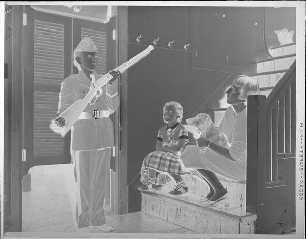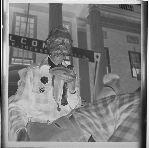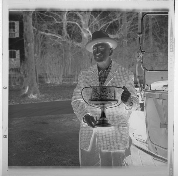 Editor: This untitled photograph by Jack Gould captures a street vendor with his wares. It’s quite small, almost snapshot-like. What can you tell us about the public role of images like this? Curator: Consider how photography, even casually, documents everyday economic activities. Street vendors, largely absent from traditional art, find a visual record here. What does its presence in a museum say about evolving cultural values? Editor: That's interesting. So, the image's value lies in documenting a common yet previously unacknowledged piece of history? Curator: Precisely! Museums shape what we deem worthy of remembering. An image like this challenges traditional notions of artistic subject matter.