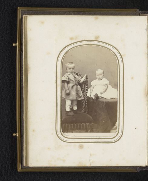 Curator: This photographic study, created between 1886 and 1888 by G.A. M\u00f6gle & Co., presents a seated boy and girl. What captures you first about this image? Editor: The stillness, definitely the stillness. They both look so serious, so contained. It feels like peering into another century, not just seeing it. It makes me wonder what world they inhabited and what expectations were placed upon them. Curator: Precisely! Group portraits in this era were rife with symbolic meaning, adhering to conventions regarding class and social roles. The boy is positioned on a rocky outcrop, a bit higher than the girl seated on what seems to be a makeshift bench, almost as if to represent his impending climb up the societal ladder as a male of that time. He’s holding an object that might suggest certain trade affiliations, or class belongings. Editor: I see what you mean. The objects and poses certainly tell a story. What interests me is how these children were likely coerced into these unnatural positions for the sake of the image. It highlights how photography then was often a performance, reinforcing societal norms but maybe hiding complex realities. The very act of freezing them in time underscores a desire to capture and preserve a specific, controlled narrative. What do you think? Does the performance ring true to you as well? Curator: Absolutely, there is an element of performance but that is just the exterior; as the artist I’m looking for what is truly being captured, the interior essence of what a family felt important to register, their aspiration as well. It makes me think of the countless anonymous subjects that exist like this. Do you ever wonder where their lineages ended, and what stories ended with them that will never come to surface? Editor: Absolutely. This image is both deeply personal and universally resonant, reminding us of the weight of history and how we all are tethered to our past, whether we fully recognize it or not. Their gazes seem to pierce through the sepia tones, challenging us to look closer, to empathize, and, maybe, to reimagine the worlds they once knew. Curator: It's true. It serves as a reminder to honor them and their stories and continue making our world better as their future descendants.
